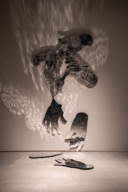 子供の頃から姿形を捉えることが好きでした。心の模様を描きたい時でも、私の作品には輪郭が存在しました。輪郭を捉えることで中身を想像しているのかもしれません。日常においても、予算を立てたり予定を組んだりして物事の形を作ります。しかし、どんなに形取ったり把握したり計画したりしても、必ずと言っていいほど予期せぬことが起こるものです。子育てがまさにそれでした。はじめから予定も目的もない状況においては、起こること全てが予期せぬことですが、私は姿形を捉えることで範囲を定め、計画をし、そこからはみだすことと遭遇し、驚きたいのだと思います。今回の個展では、影となる面に施したミラー素材に照明を当てることを計画していますが、会場でどのように反射するか、人の動きがどのような影響を与えるかは、未知数です。どうぞ作品に近づいたり覗き込んだりしてください。
